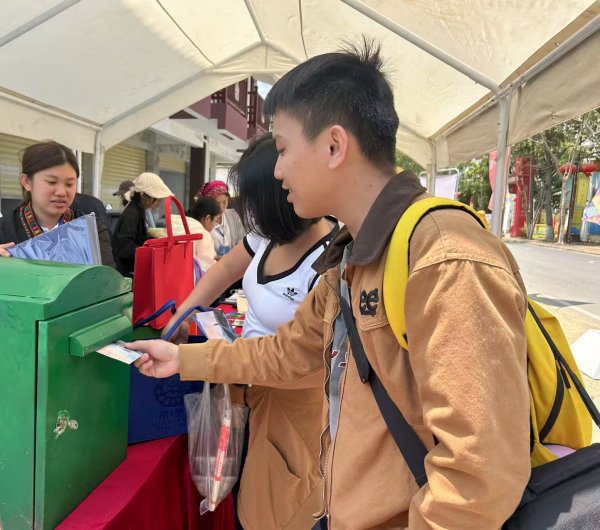 澄迈县分公司在活动体验区开设函件、集邮和文创产品展销区,吸引着众多游客驻足。除了丰富的产品展示,澄迈县分公司的工作人员还化身文化使者,对现场游客开展邮票文化宣传,普及集邮知识,让游客们深入了解集邮文化的博大精深。游客们通过民族大团结邮票,详细了解了少数民族的文化知识,纷纷赞叹方寸之间邮票的精美与深意。为了给游客们提供更加便捷、贴心的服务,现场还设置了临时邮局。游客不仅可以加盖纪念戳,留下独特的纪念;还可以将这份承载着美好回忆的邮件寄给远方的亲朋好友,分享这份来自“三月三”的喜悦。