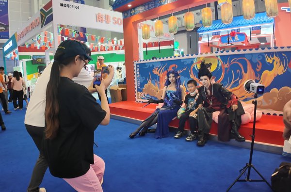 消博邮局还邀请了哪吒、敖丙、敖闰、鹤童等知名国漫IP的coser进行互动表演。他们的精彩亮相,吸引了众多大、小朋友争相合影。大家积极参与表演和游戏互动环节,模仿coser经典动作,尽情感受国漫文化的魅力。活动现场欢声笑语不断,气氛热烈非常。