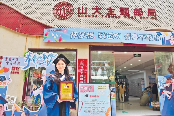该证书由山东省济南市历城区邮政分公司设计制作,首次公开启用山大专属邮票。邮票主图为山东大学校徽,副图囊括山大校门、知新楼等标志性建筑,并融入书信、邮戳等元素,深受毕业生喜爱,大家纷纷手持证书在山大校园、主题邮局等处打卡留念。