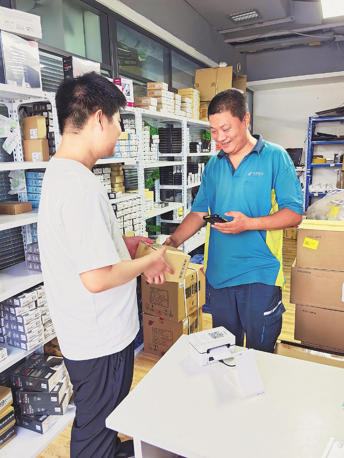 郑州市金水区邮政分公司科技市场项目组揽投员与客户交接邮件。□孟欢 摄