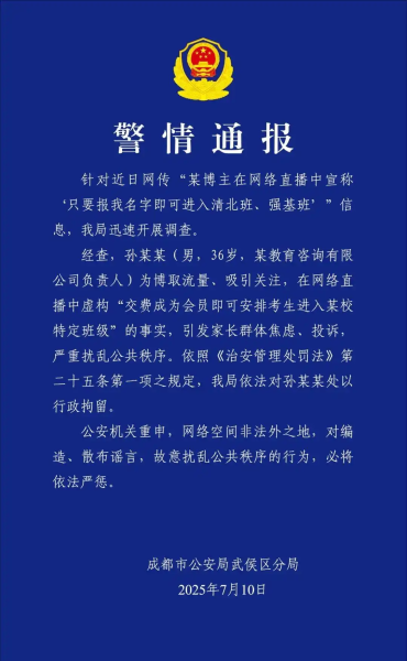 7月10日,成都市公安局武侯区分局发布警情通报。通报称:“经查,孙某某(男,36岁,某教育咨询有限公司负责人)为博取流量、吸引关注,在网络直播中虚构“交费成为会员即可安排考生进入某校特定班级”的事实,引发家长群体焦虑、投诉,严重扰乱公共秩序。依照《治安管理处罚法》第二十五条第一项之规定,我局依法对孙某某处以行政拘留。”