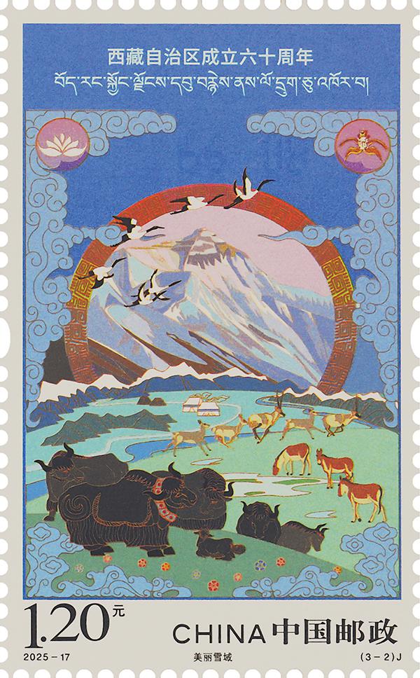 第二枚“美丽雪域”,描绘了漫步、奔跑的牦牛、藏野驴、藏羚羊,飞翔的黑颈鹤,以及阳光映照下的珠穆朗玛峰等元素,人与自然和谐相处的景象跃然纸上,展现了西藏独特的生态环境和丰富的生物多样性,体现出西藏在生态保护与生态文明建设方面取得的显著成效。
