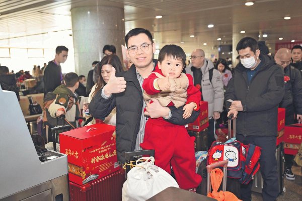 2月10日,广西壮族自治区邮政分公司在北京西站参与举办广西在京津冀务工创业人员“温暖回家”活动,并送上新春礼包,赢得老乡父子点赞。 □赵明震 摄