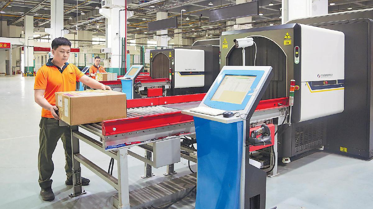 在中国邮政东盟跨境电商监管中心,邮政工作人员对包裹进行扫描、机检。