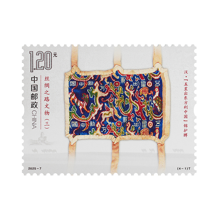 “五星出东方利中国”锦护膊出土于位于丝绸之路南道交通要冲的尼雅遗址,现藏于新疆维吾尔自治区博物馆,为汉代射箭时所用护臂(射褙)。护臂所用面锦色彩绚烂,在祥瑞云气纹样间,有序织出凤凰、鸾鸟、麒麟、白虎等瑞兽图案,上下两组循环花纹间织出“五星出东方利中国”的吉祥小篆文字,表达了祈佑祥瑞的寓意。邮票通过特种触感工艺传递古代织锦的触感。“五星出东方利中国”锦护膊是汉代精湛的丝绸制作技艺的绝佳反映,见证了丝绸之路东西方文化交流融汇。