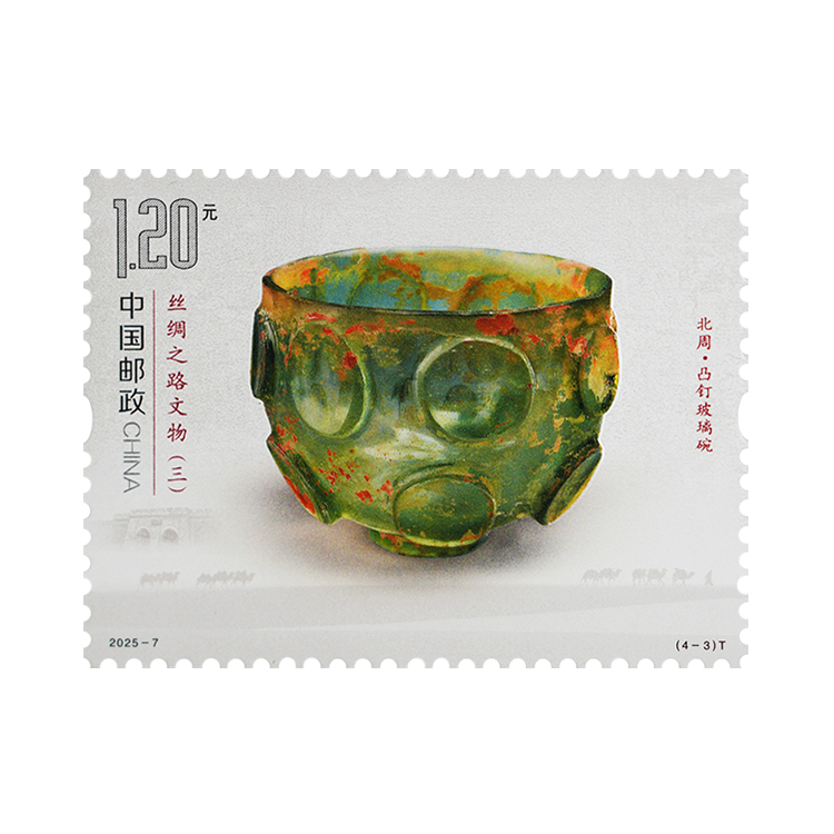 凸钉玻璃碗出土于宁夏固原市南郊的北周李贤夫妇合葬墓,现藏于宁夏回族自治区固原博物馆。该碗为直口,矮圈足,通体透明,呈碧绿色,外壁饰以14个凸起的圆形装饰两周,上下错位排列。其内壁光洁,外壁有薄层的金黄色分化物,其材质属钙钠玻璃,含有较多其它矿物质,该形制在萨珊时期的伊朗高原十分流行。邮票将特种光油和三维浮雕起凸组合应用,玻璃碗晶莹剔透的质感和立体感跃然纸上。固原作为丝绸之路西北咽喉门户,见证了东西方文化交流交融,提供了考察当时东西方贸易极为重要的资料。