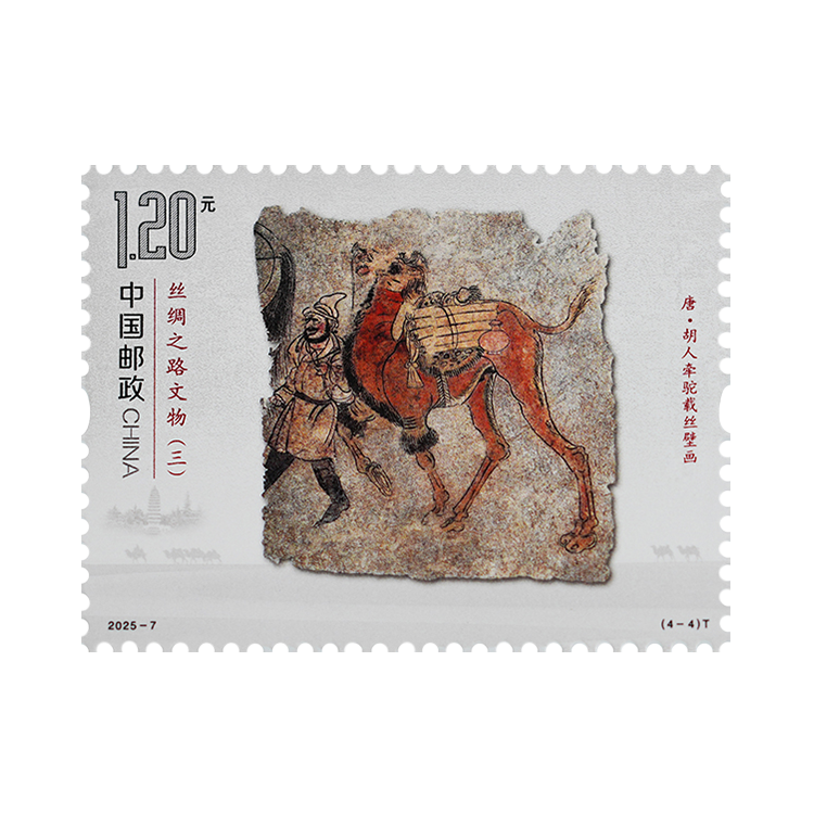 胡人牵驼载丝壁画出土于河南省洛阳市安国相王孺人唐氏墓,现藏于洛阳古墓博物馆。壁画绘制在唐氏墓墓道西壁,正中一匹高大雄健的骆驼昂首挺胸、抬蹄甩尾、阔步前进。骆驼背上,是捆扎好的丝绸卷和瓶子。前面牵缰绳的西域人高鼻梁、络腮胡,头戴尖帽,身着翻领长衫,脚蹬黑色高靿靴,正迈步牵驼前行。该壁画生动再现了各国商人来到丝绸之路的东方起点之一洛阳,装载丝绸西行走上丝绸之路的场景,客观地反映了唐代的社会场景和世俗风情,讲述着文明交流互鉴的故事。邮票结合逆向上光和哑沙工艺,既展现出壁画沧桑的历史变迁,又突出壁画中人物、饰物、动物等不同的色彩效果,赋予其独特的艺术气质。