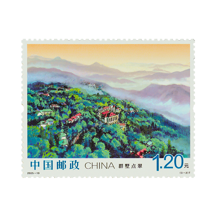 第二枚“群墅点翠”,呈现了莫干山的建筑风貌。此枚邮票将掩映在翠竹间众多风格各异的别墅尽收眼底,别墅群落依山就势,错落层叠,红瓦青砖与修竹劲松相映成趣。每一顶屋檐、每一道门廊、每一方露台,都镌刻着莫干山的发展脉络、改革印记,中西对话在此完成碰撞交融。