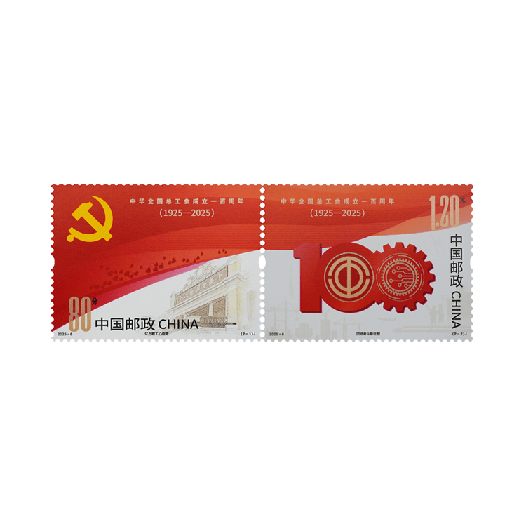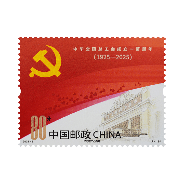 中国邮政拟定于2025年5月1日发行《中华全国总工会成立一百周年》纪念邮票1套2枚,邮票图案名称为:亿万职工心向党、团结奋斗新征程。