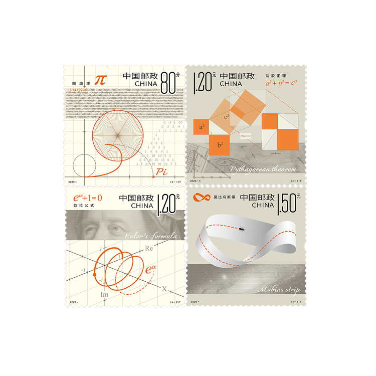 中国邮政定于2025年3月14日发行《数学之美》特种邮票1套4枚,邮票图案名称为:圆周率、勾股定理、欧拉公式、莫比乌斯带。全套邮票面值4.70元。邮票计划发行数量为套票625万套,版式二80万版。