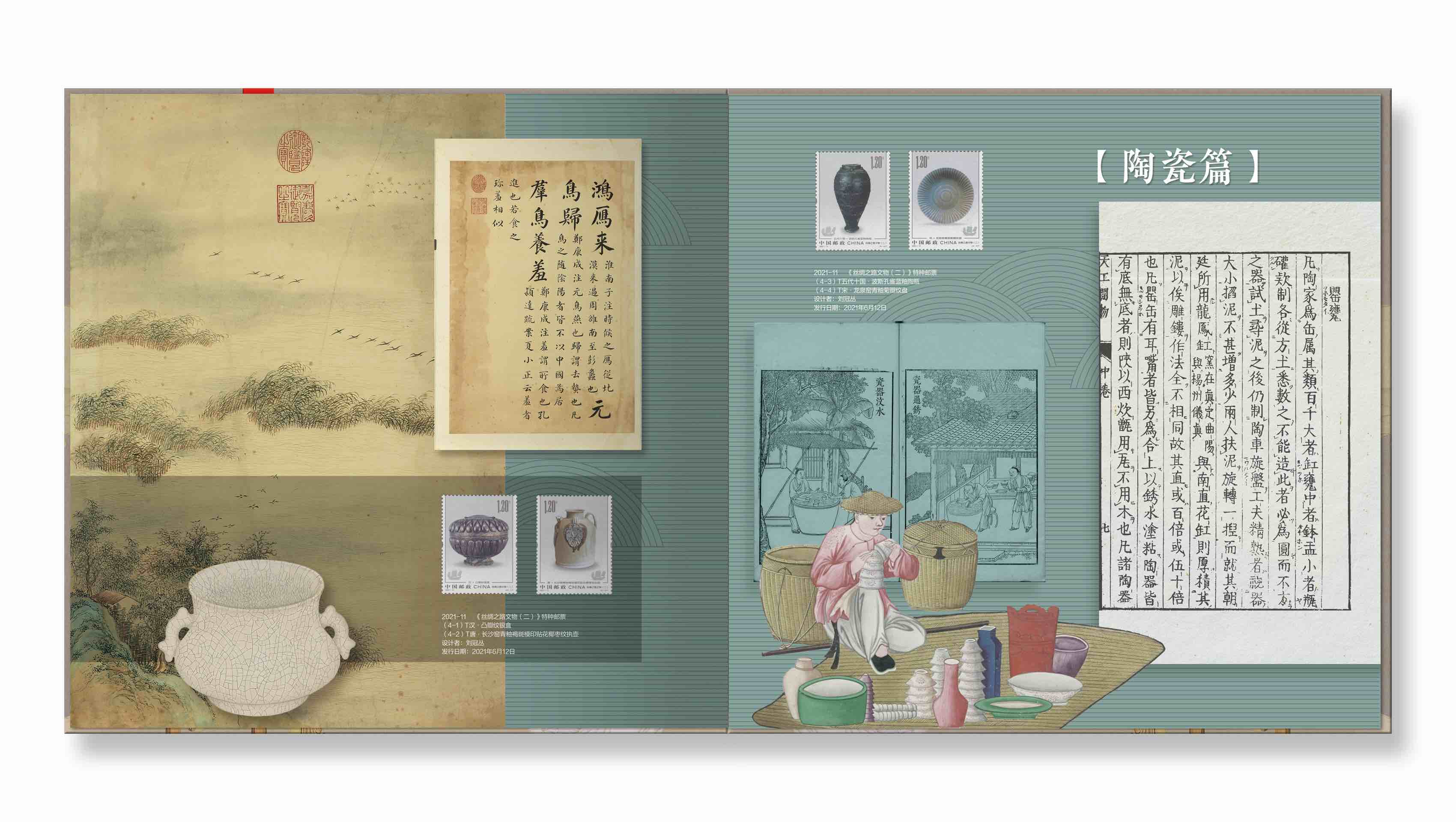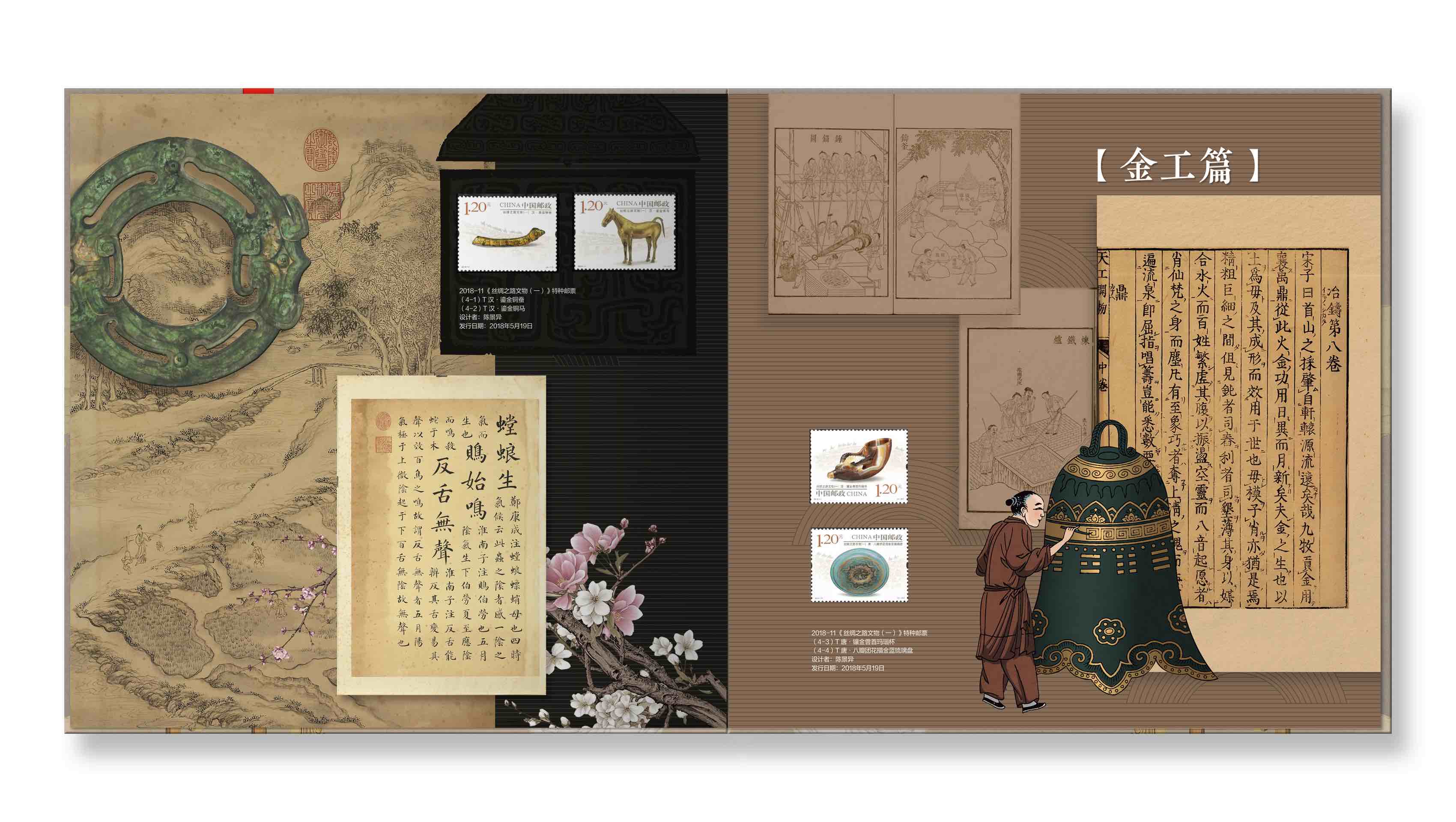 聚焦不同工艺类别来打造邮册主题。邮册设计以展示中国古代传统手工艺制作内容为主,结合了丝绸之路承载东西文明交汇、交流的特殊历史意义,从史料文献以及古代绘画内容中提炼出相关内容,与丝绸之路文物邮票相互呼应。设计色调古朴典雅,渗透出中华文明的历史积淀。