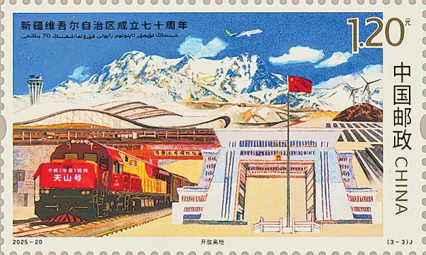邮票图案采用岩彩绘画技法创作。第一枚“美丽新疆”,画面主体为新疆城市美景,前景绽放的玫瑰代表塔克拉玛干沙漠“锁边”工程,背景为昆仑山慕士塔格峰和卡拉库里湖。第二枚“团结和睦”,画面表现了新疆各民族、各行业群众团结和谐、亲如一家的场景。第三枚“开放高地”,画面以中欧班列、霍尔果斯国门为主体,远景展现了乌鲁木齐国际机场、光伏电站和博格达峰。邮票充分展现了在新疆这片美丽、广袤的土地上,传统与现代交织,自然与人文共生,古老与青春共舞;生动描绘了各族群众获得感、幸福感、安全感不断增强的美好图景,各族群众像石榴籽一样紧紧抱在一起,在中国式现代化进程中更好建设团结和谐、繁荣富裕、文明进步、安居乐业、生态良好的美丽新疆。